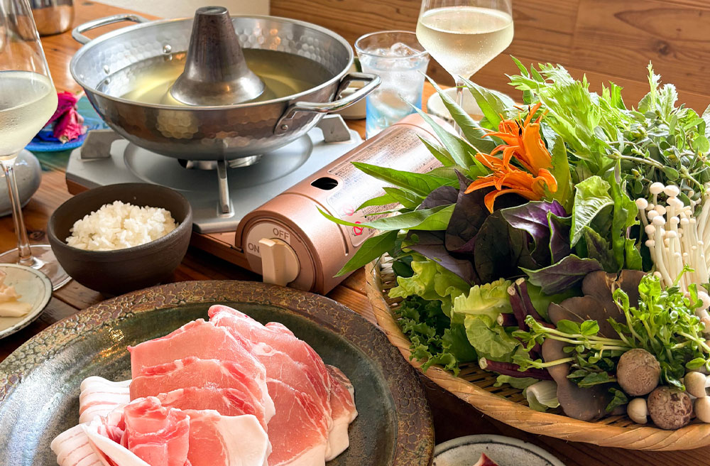 やんばる採れたて島野菜と沖縄で選び抜かれた琉球在来種アグー。東京西麻布や京都嵐山の名店などで腕を磨いた新崎シェフ(もとぶ町のしゃぶしゃぶ専門店ShabuMasa創業者)による特別なしゃぶしゃぶです。シークヮーサー果汁の柑橘ポン酢、香ばしい胡麻ダレ、シェフ秘伝の出汁、デザートまですべて自家製。とろけるアグーの豊かな旨味と旬の地元野菜の濃厚な風味を引き立て、天然素材本来の美味しさを体感できます。